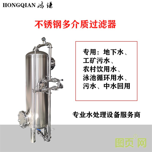 不锈钢机械过滤器(又称石英砂过滤器)是将需过滤的水经泵升压后(约0.6MPa)通过滤层达到过滤目的,所以又称压力式过滤器。按进水方式可分为单流式机械过滤器和双流式机械过 滤器。前者水流方向自上而下,后者却是上下两端进水,中部出水。按滤料装填情况,又可分为单层滤料机械过滤器和双层(多层)机械过滤器。